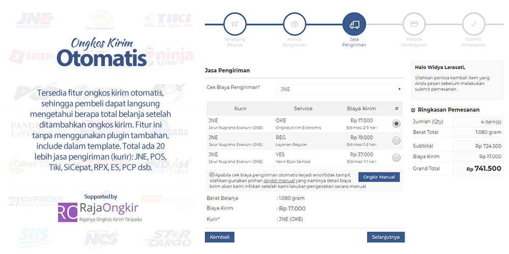 Tersedia fitur ongkos kirim otomatis, sehingga pembeli dapat langsung mengetahui berapa total belanja setelah ditambahkan ongkos kirim. Fitur ini tanpa menggunakan plugin tambahan, include dalam template. Total ada 20 lebih jasa pengiriman (kurir): JNE, POS, Tiki, SiCepat, RPX, ES, PCP dsb.