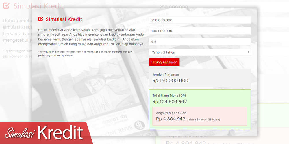 Tersedia kalkulator simulasi kredit yang dapat digunakan oleh calon customer website Anda untuk menghitung kisaran kredit per bulan apabila membeli melalui sistem kredit (leasing). *include, tanpa perlu plugin tambahan